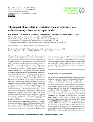 Sampson, C. C., Fewtrell, T. J., O'Loughlin, F., Pappenberger, F., Bates, P., Freer, J. E. and Cloke, H. L. orcid id iconORCID: https://orcid.org/0000-0002-1472-868X (2014) The impact of uncertain precipitation data on insurance loss estimates using a flood catastrophe model. Hydrology and Earth System Sciences, 18. pp. 2305-2324. ISSN 1027-5606 doi: 10.5194/hess-18-2305-2014