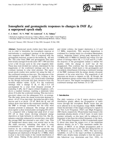 Superposed epoch studies have been carried out in order to determine the ionospheric response at mid-latitudes to southward turnings of the interplanetary magnetic field (IMF). This is compared with the geomagnetic response, as seen in the indices K p, AE and Dst. The solar wind, IMF and geomagnetic data used were hourly averages from the years 1967–1989 and thus cover a full 22-year cycle in the solar magnetic field. These data were divided into subsets, determined by the magnitudes of the southward turnings and the concomitant increase in solar wind pressure. The superposed epoch studies were carried out using the time of the southward turning as time zero. The response of the mid-latitude ionosphere is studied by looking at the F-layer critical frequencies, f o F2, from hourly soundings by the Slough ionosonde and their deviation from the monthly median values, δf o F2. For the southward turnings with a change in B z of δB z > 11.5 nT accompanied by a solar wind dynamic pressure P exceeding 5 nPa, the F region critical frequency, f o F2, shows a marked decrease, reaching a minimum value about 20 h after the southward turning. This recovers to pre-event values over the subsequent 24 h, on average. The Dst index shows the classic storm-time decrease to about −60 nT. Four days later, the index has still to fully recover and is at about −25 nT. Both the K p and AE indices show rises before the southward turnings, when the IMF is strongly northward but the solar wind dynamic pressure is enhanced. The average AE index does register a clear isolated pulse (averaging 650 nT for 2 h, compared with a background peak level of near 450 nT at these times) showing enhanced energy deposition at high latitudes in substorms but, like K p, remains somewhat enhanced for several days, even after the average IMF has returned to zero after 1 day. This AE background decays away over several days as the Dst index recovers, indicating that there is some contamination of the currents observed at the AE stations by the continuing enhanced equatorial ring current. For data averaged over all seasons, the critical frequencies are depressed at Slough by 1.3 MHz, which is close to the lower decile of the overall distribution of δf o Fl values. Taking 30-day periods around summer and winter solstice, the largest depression is 1.6 and 1.2 MHz, respectively. This seasonal dependence is confirmed by a similar study for a Southern Hemisphere station, Argentine Island, giving peak depressions of 1.8 MHz and 0.5 MHz for summer and winter. For the subset of turnings where δB z > 11.5 nT and P ≤ 5 nPa, the response of the geomagnetic indices is similar but smaller, while the change in δf o F2 has all but disappeared. This confirms that the energy deposited at high latitudes, which leads to the geomagnetic and ionospheric disturbances following a southward turning of the IMF, increases with the energy density (dynamic pressure) of the solar wind flow. The magnitude of all responses are shown to depend on δB z . At Slough, the peak depression always occurs when Slough rotates into the noon sector. The largest ionospheric response is for southward turnings seen between 15–21 UT.