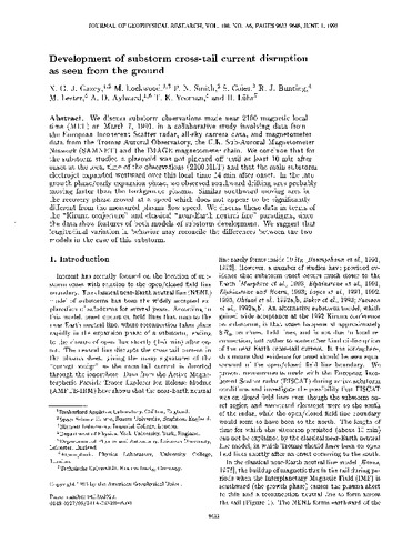 We discuss substorm observations made near 2100 magnetic local time (MLT) on March 7, 1991, in a collaborative study involving data from the European Incoherent Scatter radar, all-sky camera data, and magnetometer data from the Tromsø Auroral Observatory, the U.K. Sub-Auroral Magnetometer Network (SAMNET) and the IMAGE magnetometer chain. We conclude that for the substorm studied a plasmoid was not pinched off until at least 10 min after onset at the local time of the observations (2100 MLT) and that the main substorm electrojet expanded westward over this local time 14 min after onset. In the late growth phase/early expansion phase, we observed southward drifting arcs probably moving faster than the background plasma. Similar southward moving arcs in the recovery phase moved at a speed which does not appear to be significantly different from the measured plasma flow speed. We discuss these data in terms of the “Kiruna conjecture” and classical “near-Earth neutral line” paradigms, since the data show features of both models of substorm development. We suggest that longitudinal variation in behavior may reconcile the differences between the two models in the case of this substorm.