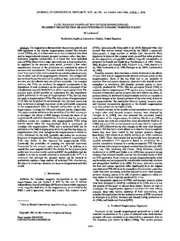 The suggestion is discussed that characteristic particle and field signatures at the dayside magnetopause, termed “flux transfer events” (FTEs), are, in at least some cases, due to transient solar wind and/or magnetosheath dynamic pressure increases, rather than time-dependent magnetic reconnection. It is found that most individual cases of FTEs observed by a single spacecraft can, at least qualitatively, be explained by the pressure pulse model, provided a few rather unsatisfactory features of the predictions are explained in terms of measurement uncertainties. The most notable exceptions to this are some “two-regime” observations made by two satellites simultaneously, one on either side of the magnetopause. However, this configuration has not been frequently achieved for sufficient time, such observations are rare, and the relevant tests are still not conclusive. The strongest evidence that FTEs are produced by magnetic reconnection is the dependence of their occurrence on the north-south component of the interplanetary magnetic field (IMF) or of the magnetosheath field. The pressure pulse model provides an explanation for this dependence (albeit qualitative) in the case of magnetosheath FTEs, but this does not apply to magnetosphere FTEs. The only surveys of magnetosphere FTEs have not employed the simultaneous IMF, but have shown that their occurrence is strongly dependent on the north-south component of the magnetosheath field, as observed earlier/later on the same magnetopause crossing (for inbound/outbound passes, respectively). This paper employs statistics on the variability of the IMF orientation to investigate the effects of IMF changes between the times of the magnetosheath and FTE observations. It is shown that the previously published results are consistent with magnetospheric FTEs being entirely absent when the magnetosheath field is northward: all crossings with magnetosphere FTEs and a northward field can be attributed to the field changing sense while the satellite was within the magnetosphere (but close enough to the magnetopause to detect an FTE). Allowance for the IMF variability also makes the occurrence frequency of magnetosphere FTEs during southward magnetosheath fields very similar to that observed for magnetosheath FTEs. Conversely, the probability of attaining the observed occurrence frequencies for the pressure pulse model is 10−14. In addition, it is argued that some magnetosheath FTEs should, for the pressure pulse model, have been observed for northward IMF: the probability that the number is as low as actually observed is estimated to be 10−10. It is concluded that although the pressure model can be invoked to qualitatively explain a large number of individual FTE observations, the observed occurrence statistics are in gross disagreement with this model.