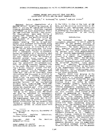 Optical observations of a dayside auroral brightening sequence, by means of all-sky TV cameras and meridian scanning photometers, have been combined with EISCAT ion drift observations within the same invariant latitude-MLT sector. The observations were made during a January 1989 campaign by utilizing the high F region ion densities during the maximum phase of the solar cycle. The characteristic intermittent optical events, covering ∼300 km in east-west extent, move eastward (antisunward) along the poleward boundary of the persistent background aurora at velocities of ∼1.5 km s−1 and are associated with ion flows which swing from eastward to westward, with a subsequent return to eastward, during the interval of a few minutes when there is enhanced auroral emission within the radar field of view. The breakup of discrete auroral forms occurs at the reversal (negative potential) that forms between eastward plasma flow, maximizing near the persistent arc poleward boundary, and strong transient westward flow to the south. The reported events, covering a 35 min interval around 1400 MLT, are embedded within a longer period of similar auroral activity between 0830 (1200 MLT) and 1300 UT (1600 MLT). These observations are discussed in relation to recent models of boundary layer plasma dynamics and the associated magnetosphere-ionosphere coupling. The ionospheric events may correspond to large-scale wave like motions of the low-latitude boundary layer (LLBL)/plasma sheet (PS) boundary. On the basis of this interpretation the observed spot size, speed and repetition period (∼10 min) give a wavelength (the distance between spots) of ∼900 km in the present case. The events can also be explained as ionospheric signatures of newly opened flux tubes associated with reconnection bursts at the magnetopause near 1400 MLT. We also discuss these data in relation to random, patchy reconnection (as has recently been invoked to explain the presence of the sheathlike plasma on closed field lines in the LLBL). In view of the lack of IMF data, and the existing uncertainty on the location of the open-closed field line boundary relative to the optical events, an unambiguous discrimination between the different alternatives is not easily obtained.