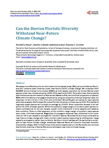 Heap, M. J., Culham, A. orcid id iconORCID: https://orcid.org/0000-0002-7440-0133, Lenoir, J. and Gavilán, R. G. (2014) Can the Iberian floristic diversity withstand near-future climate change? Open Journal of Ecology, 4 (17). pp. 1089-1101. ISSN 2162-1985 doi: 10.4236/oje.2014.417089