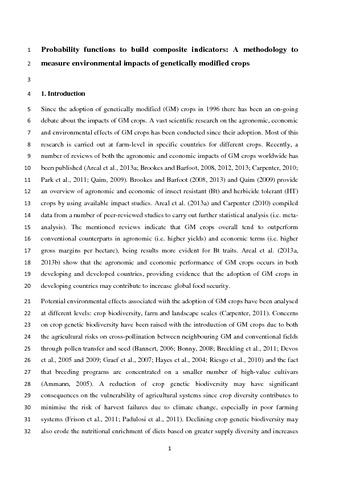 Areal, F. J. and Riesgo, L. (2015) Probability functions to build composite indicators: a methodology to measure environmental impacts of genetically modified crops. Ecological Indicators, 52. pp. 498-516. ISSN 1470-160X doi: 10.1016/j.ecolind.2015.01.008