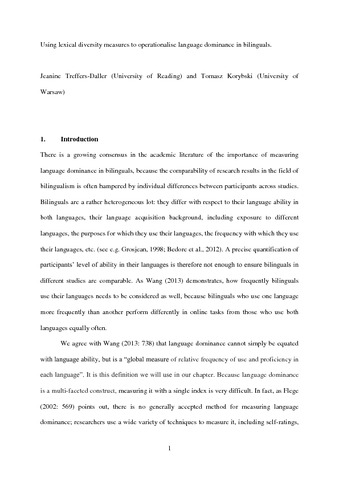 Treffers-Daller, J. orcid id iconORCID: https://orcid.org/0000-0002-6575-6736 and Korybski, T. (2015) Using lexical diversity measures to operationalise language dominance in bilinguals. In: Silva-Corvalan, C. and Treffers-Daller, J. orcid id iconORCID: https://orcid.org/0000-0002-6575-6736 (eds.) Language dominance in bilinguals: issues of measurement and operationalization. Cambridge University Press, Cambridge, pp. 106-123. ISBN 9781107044494