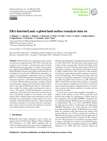Balsamo, G., Albergel, C., Beljaars, A., Boussetta, S., Brun, E., Cloke, H. orcid id iconORCID: https://orcid.org/0000-0002-1472-868X, Dee, D., Dutra, E., Muñoz-Sabater, J., Pappenberger, F., de Rosnay, P., Stockdale, T. and Vitart, F. (2015) ERA-Interim/Land: a global land surface reanalysis data set. Hydrology and Earth System Sciences, 19 (1). pp. 389-407. ISSN 1027-5606 doi: 10.5194/hess-19-389-2015