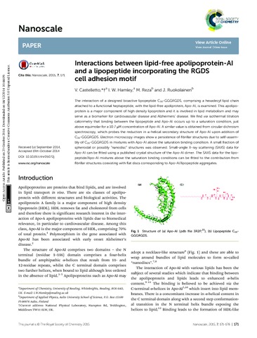 Interactions between lipid-free apolipoprotein-AI and a lipopeptide incorporating the RGDS cell adhesion motif.