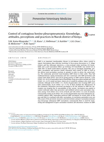 Kairu-Wanyoike, S. W., Kiara, H., Heffernan, C., Kaitibie, S., Gitae, G. K., McKeever, D. and Taylor, N. M. (2014) Control of contagious bovine pleuropneumonia: knowledge, attitudes, perceptions and practices in Narok district of Kenya. Preventive Veterinary Medicine, 115 (3-4). pp. 143-156. ISSN 0167-5877 doi: 10.1016/j.prevetmed.2014.03.029