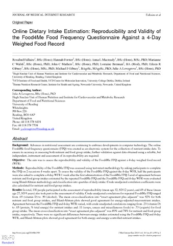 Background: Advances in nutritional assessment are continuing to embrace developments in computer technology. The online Food4Me food frequency questionnaire (FFQ) was created as an electronic system for the collection of nutrient intake data. To ensure its accuracy in assessing both nutrient and food group intake, further validation against data obtained using a reliable, but independent, instrument and assessment of its reproducibility are required. Objective: The aim was to assess the reproducibility and validity of the Food4Me FFQ against a 4-day weighed food record (WFR). Methods: Reproducibility of the Food4Me FFQ was assessed using test-retest methodology by asking participants to complete the FFQ on 2 occasions 4 weeks apart. To assess the validity of the Food4Me FFQ against the 4-day WFR, half the participants were also asked to complete a 4-day WFR 1 week after the first administration of the Food4Me FFQ. Level of agreement between nutrient and food group intakes estimated by the repeated Food4Me FFQ and the Food4Me FFQ and 4-day WFR were evaluated using Bland-Altman methodology and classification into quartiles of daily intake. Crude unadjusted correlation coefficients were also calculated for nutrient and food group intakes. Results: In total, 100 people participated in the assessment of reproducibility (mean age 32, SD 12 years), and 49 of these (mean age 27, SD 8 years) also took part in the assessment of validity. Crude unadjusted correlations for repeated Food4Me FFQ ranged from .65 (vitamin D) to .90 (alcohol). The mean cross-classification into “exact agreement plus adjacent” was 92% for both nutrient and food group intakes, and Bland-Altman plots showed good agreement for energy-adjusted macronutrient intakes. Agreement between the Food4Me FFQ and 4-day WFR varied, with crude unadjusted correlations ranging from .23 (vitamin D) to .65 (protein, % total energy) for nutrient intakes and .11 (soups, sauces and miscellaneous foods) to .73 (yogurts) for food group intake. The mean cross-classification into “exact agreement plus adjacent” was 80% and 78% for nutrient and food group intake, respectively. There were no significant differences between energy intakes estimated using the Food4Me FFQ and 4-day WFR, and Bland-Altman plots showed good agreement for both energy and energy-controlled nutrient intakes. Conclusions: The results demonstrate that the online Food4Me FFQ is reproducible for assessing nutrient and food group intake and has moderate agreement with the 4-day WFR for assessing energy and energy-adjusted nutrient intakes. The Food4Me FFQ is a suitable online tool for assessing dietary intake in healthy adults.