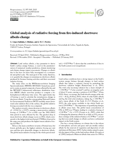 López-Saldaña, G., Bistinas, I. and Pereira, J. M. C. (2015) Global analysis of radiative forcing from fire-induced shortwave albedo change. Biogeosciences, 12 (2). pp. 557-565. ISSN 1726-4170 doi: 10.5194/bg-12-557-2015