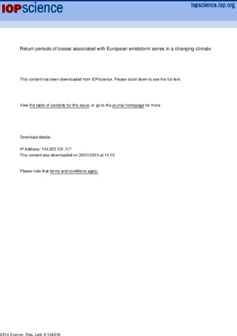 Karremann, M. K., Pinto, J. G., Reyers, M. and Klawa, M. (2014) Return periods of losses associated with European windstorm series in a changing climate. Environmental Research Letters, 9 (12). 124016. ISSN 1748-9326 doi: 10.1088/1748-9326/9/12/124016