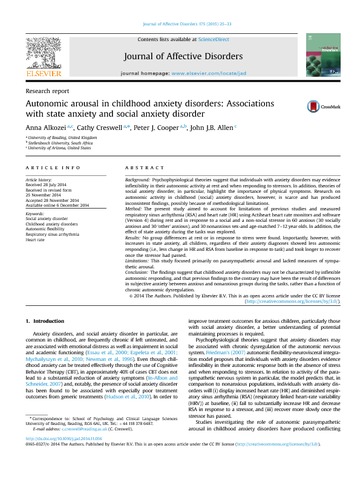 Alkozei, A., Creswell, C., Cooper, P. and Allen, J. (2015) Autonomic arousal in childhood anxiety disorders: associations with state anxiety and social anxiety disorder. Journal of Affective Disorders, 175. pp. 25-33. ISSN 0165-0327 doi: 10.1016/j.jad.2014.11.056