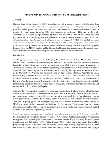 Liyanagunawardena, T. R., Lundqvist, K. O. and Williams, S. A. (2015) Who are with us: MOOC learners on a FutureLearn course. British Journal of Educational Technology, 46 (3). pp. 557-569. ISSN 1467-8535 doi: 10.1111/bjet.12261 (Special issue on MOOCs)
