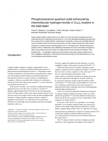 Organo-copper(I) halide complexes with a Cu4I4 cubane core and cyclic amines as ligands have been synthesized and their crystal structures have been defined. Their solid state photophysical properties have been measured and correlated with the crystal structure and packing. A unique and remarkably high luminescence quantum yield (76%) has been measured for one of the complexes having the cubane clusters arranged in a columnar structure and held together by N–HI hydrogen bonds. This high luminescence quantum yield is correlated with a slow radiationless deactivation rate of the excited state and suggests a rather strong enhancement of the cubane core rigidity bestowed by the hydrogen bond pattern. Some preliminary thin film deposition experiments show that these compounds could be considered to be good candidates for applications in electroluminescent devices because of their bright luminescence, low cost and relatively easy synthesis processes