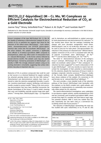 [M(CO)4(2,2′-bipyridine)] (M = Cr, Mo, W) as efficient catalysts for electrochemical reduction of CO2 to CO at a gold electrode.