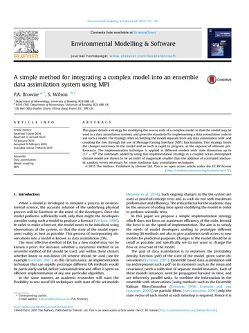 Browne, P. A. and Wilson, S. (2015) A simple method for integrating a complex model into an ensemble data assimilation system using MPI. Environmental Modelling & Software, 68. pp. 122-128. ISSN 1364-8152 doi: 10.1016/j.envsoft.2015.02.003