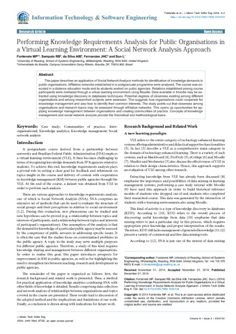 Fontenele, M. P., Sampaio, R. B., da Silva, A. I. B., Fernandes, J. H. C. and Sun, L. (2014) Performing knowledge requirements analysis for public organisations in a Virtual Learning Environment: a social network analysis approach. Journal of Information Technology & Software Engineering, 4 (2). 134. ISSN 2165-7866 doi: 10.4172/2165-7866.1000134