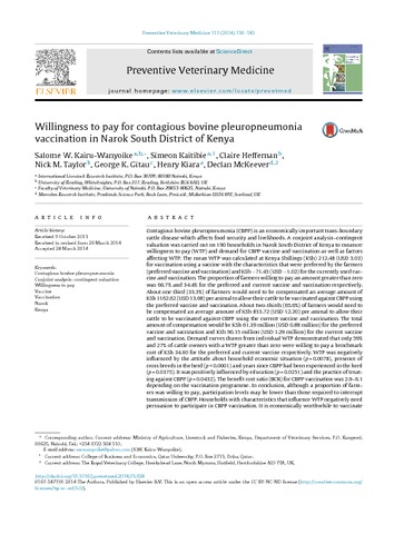 Kairu-Wanyoike, S. W., Kaitibie, S., Heffernan, C., Taylor, N. M., Gitau, G. K., Kiara, H. and McKeever, D. (2014) Willingness to pay for contagious bovine pleuropneumonia vaccination in Narok South District of Kenya. Preventive Veterinary Medicine, 115 (3-4). pp. 130-142. ISSN 0167-5877 doi: 10.1016/j.prevetmed.2014.03.028