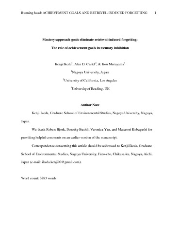 Ikeda, K., Castel, A., D. and Murayama, K. (2015) Mastery-approach goals eliminate retrieval-induced forgetting: the role of achievement goals in memory inhibition. Personality and Social Psychology Bulletin, 41 (5). pp. 687-695. ISSN 0146-1672 doi: 10.1177/0146167215575730