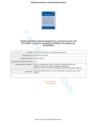 Altonsy, M., Habib, T. and Andrews, S. orcid id iconORCID: https://orcid.org/0000-0003-4295-2686 (2012) Diallyl disulfide-induced apoptosis in a breast-cancer cell line (MCF-7) may be caused by inhibition of histone de-acetylation. Nutrition and Cancer, 64 (8). pp. 1251-1260. ISSN 1532-7914 doi: 10.1080/01635581.2012.721156