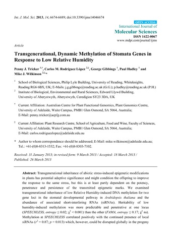 Tricker, P. J., Rodríguez López, C. M., Gibbings, G., Hadley, P. and Wilkinson, M. J. (2013) Transgenerational, dynamic methylation of stomata genes in response to low relative humidity. International Journal of Molecular Sciences, 14 (4). pp. 6674-6689. ISSN 1422-0067 doi: 10.3390/ijms14046674