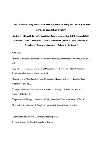 Taylor, T. B., Mulley, G. orcid id iconORCID: https://orcid.org/0000-0003-0650-478X, Dills, A. H., Alsohim, A. S., McGuffin, L. J. orcid id iconORCID: https://orcid.org/0000-0003-4501-4767, Studholme, D. J., Silby, M. W., Brockhurst, M. A., Johnson, L. J. orcid id iconORCID: https://orcid.org/0000-0002-0006-1511 and Jackson, R. W. (2015) Evolutionary resurrection of flagellar motility via rewiring of the nitrogen regulation system. Science, 347 (6225). pp. 1014-1017. ISSN 0036-8075 doi: 10.1126/science.1259145