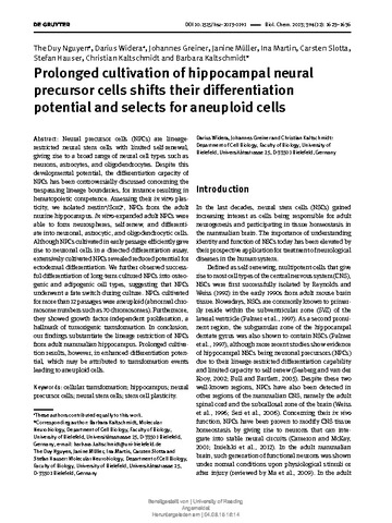 Nguyen, T. D., Widera, D. orcid id iconORCID: https://orcid.org/0000-0003-1686-130X, Greiner, J., Müller, J., Martin, I., Slotta, C., Hauser, S., Kaltschmidt, C. and Kaltschmidt, B. (2013) Prolonged cultivation of hippocampal neural precursor cells shifts their differentiation potential and selects for aneuploid cells. Biological chemistry, 394 (12). pp. 1623-1636. ISSN 1437-4315 doi: 10.1515/hsz-2013-0191
