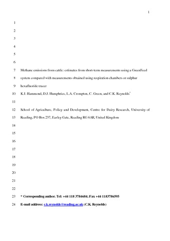 Methane emissions from cattle: estimates from short-term measurements using a Green Feed system compared with measurements obtained using respiration chambers or sulphur hexafluoride tracer.