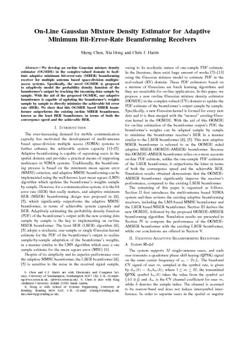 We develop an on-line Gaussian mixture density estimator (OGMDE) in the complex-valued domain to facilitate adaptive minimum bit-error-rate (MBER) beamforming receiver for multiple antenna based space-division multiple access systems. Specifically, the novel OGMDE is proposed to adaptively model the probability density function of the beamformer’s output by tracking the incoming data sample by sample. With the aid of the proposed OGMDE, our adaptive beamformer is capable of updating the beamformer’s weights sample by sample to directly minimize the achievable bit error rate (BER). We show that this OGMDE based MBER beamformer outperforms the existing on-line MBER beamformer, known as the least BER beamformer, in terms of both the convergence speed and the achievable BER.