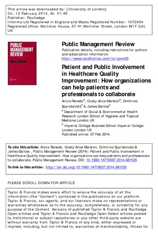 Renedo, A., Marston, C. A., Spyridonidis, D. and Barlow, J. (2014) Patient and public involvement in healthcare quality improvement: how organizations can help patients and professionals to collaborate. Public Management Review, 17 (1). pp. 17-34. ISSN 1471-9037 doi: 10.1080/14719037.2014.881535