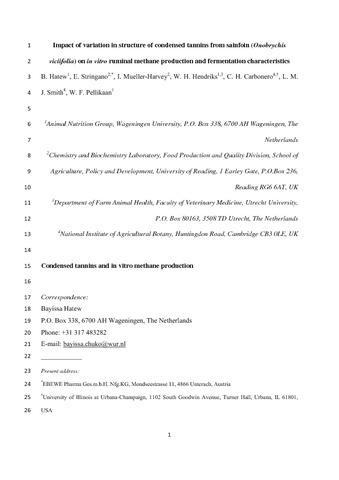 Hatew, B., Stringano, E., Mueller-Harvey, I., Hendriks, W. H., Hayot Carbonero, C., Smith, L. M. J. and Pellikaan, W. F. (2016) Impact of variation in structure of condensed tannins from sainfoin (Onobrychis viciifolia) on in vitro ruminal methan production and fermentation characteristics. Journal of Animal Physiology and Animal Nutrition, 100 (2). pp. 348-360. ISSN 1439-0396 doi: 10.1111/jpn.12336
