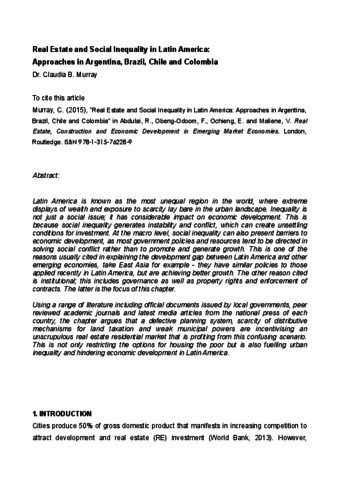 Murray, C. B. (2015) Real estate and social inequality in Latin America: approaches in Argentina, Brazil, Chile and Colombia. In: Abduai, R. T., Obeng-Odoom, F., Ochieng, E. and Maliene, V. (eds.) Real Estate, Construction and Economic Development in Emerging Market Economies. Routledge, Abingdon, pp. 256-276. ISBN 9780415747899