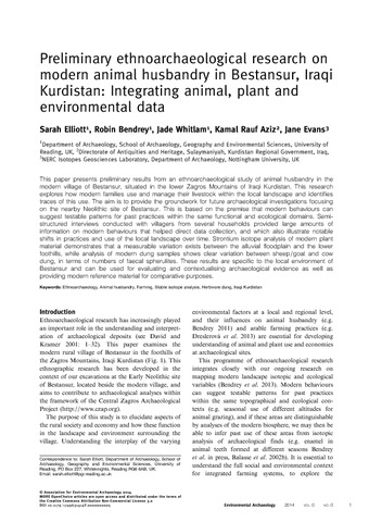 Elliott, S., Bendrey, R., Whitlam, J., Aziz, K. R. and Evans, J. (2015) Preliminary ethnoarchaeological research on modern animal husbandry in Bestansur, Iraqi Kurdistan: integrating animal, plant and environmental data. Environmental Archaeology: the Journal of Human Palaeoecology, 20 (3). pp. 283-303. ISSN 1461-4103 doi: 10.1179/1749631414Y.0000000025