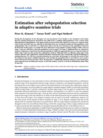 Kimani, P. K., Todd, S. orcid id iconORCID: https://orcid.org/0000-0002-9981-923X and Stallard, N. (2015) Estimation after subpopulation selection in adaptive seamless trials. Statistics in Medicine, 34 (18). pp. 2581-2601. ISSN 0277-6715 doi: 10.1002/sim.6506