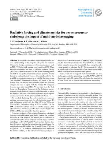Radiative forcing and climate metrics for ozone precursor emissions: the impact of multi-model averaging.