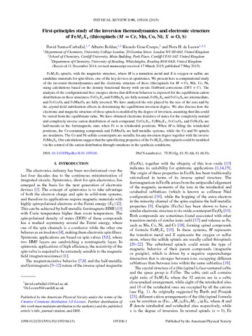 Santos-Carballal, D., Roldan, A., Grau-Crespo, R. orcid id iconORCID: https://orcid.org/0000-0001-8845-1719 and de Leeuw, N.H. (2015) First-principles study of the inversion thermodynamics and electronic structure of FeM2X4 (thio)spinels (M = Cr, Mn, Co, Ni; X = O, S). Physical Review B, 91 (19). 195106. ISSN 1550-235X doi: 10.1103/PhysRevB.91.195106