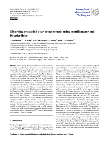 van Dinther, D., Wood, C. R., Hartogensis, O. K., Nordbo, A. and O'Connor, E. J. (2015) Observing crosswind over urban terrain using scintillometer and Doppler lidar. Atmospheric Measurement Techniques, 8 (4). pp. 1901-1911. ISSN 1867-8548 doi: 10.5194/amt-8-1901-2015