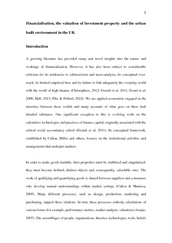 The financialisation literature has been criticised for its limited empirical base and its failure adequately to link the everyday world with that of high finance. The paper addresses these shortcomings by examining the calculative practice of property valuation. The way that valuations are performed affects their results and, therefore, the operation of the property market. The paper traces the evolving influence of finance capital on the valuation of commercial property in the UK by constructing a historiography of investment valuation since 1960. Traditional approaches to valuation have been increasingly challenged by those derived from financial economics. However, the former remains the dominant method for undertaking market valuation. Its grounding in comparison – a centring and standardising process – offers an explanation for some of the changes in the urban built environment that are ascribed to financialisation. This suggests that a more detailed and historically sensitive interpretation of financialisation is required.