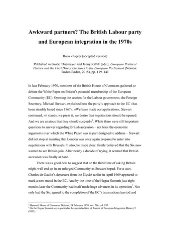 Broad, M. (2015) Awkward partners? The British Labour party and European integration in the 1970s. In: Thiemeyer, G. and Raflik, J. (eds.) European political parties and the first direct elections to the European Parliament. Nomos, Baden-Baden, Germany, pp. 119-141. ISBN 9783848719921