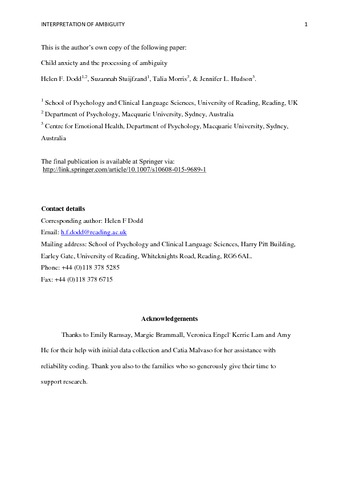 Dodd, H. F. orcid id iconORCID: https://orcid.org/0000-0003-1446-5338, Stuijfzand, S., Morris, T. and Hudson, J. L. (2015) Child anxiety and the processing and ambiguity. Cognitive Therapy and Research, 39 (5). pp. 669-677. ISSN 0147-5916 doi: 10.1007/s10608-015-9689-1