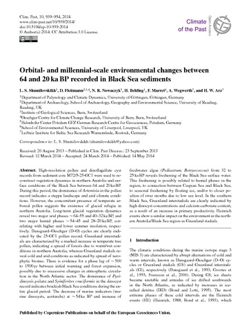 Schumilovskikh, L.S., Fleitmann, D., Nowaczyk, N.R., Behling, H., Marret, F., Wegwerth, A. and Arz, H. W. (2014) Orbital and millenial-scale environmental changes between 64 and 25 ka BP recorded in Black Sea sediments. Climate of the Past, 10. pp. 939-945. ISSN 1814-9324 doi: 10.5194/cp-10-939-2014