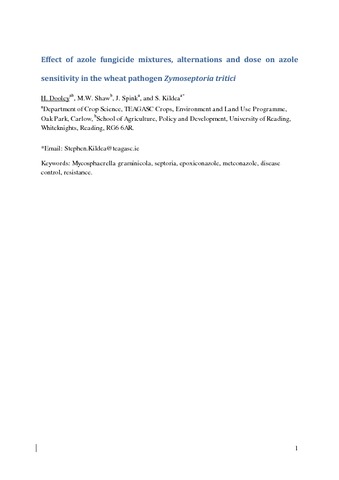 Dooley, H., Shaw, M., Spink, J. and Kildea, S. (2016) Effect of azole fungicide mixtures, alternations and dose on azole sensitivity in the wheat pathogen Zymoseptoria tritici. Plant Pathology, 65 (1). pp. 124-136. ISSN 0032-0862 doi: 10.1111/ppa.12395