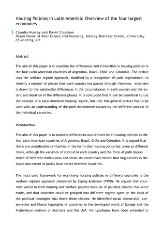 Murray, C. and Clapham, D. (2015) Housing Policies in Latin America: overview of the four largest economies. International Journal of Housing Policy, 15 (3). pp. 347-364. ISSN 1461-6718 doi: 10.1080/14616718.2015.1055090