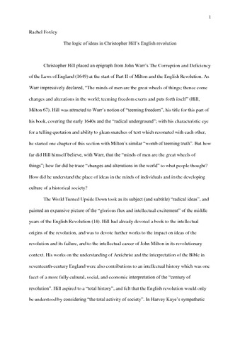 Foxley, R. (2015) The logic of ideas in Christopher Hill's English revolution. Prose Studies: History, Theory, Criticism, 36 (3). pp. 199-208. ISSN 0144-0357 doi: 10.1080/01440357.2014.994727