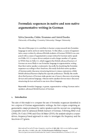 | Uncontrolled Keywords | formulaic language, n-grams, argumentative writing, German, English, native speakers, British learners of German, non-native speakers |