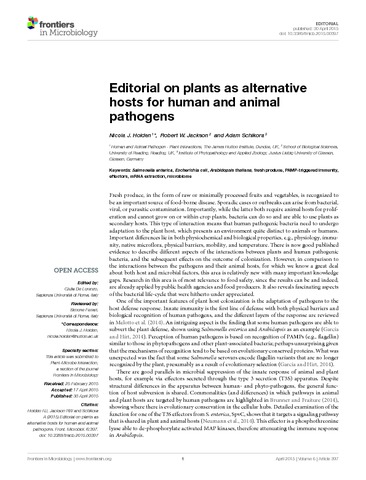 Holden, N. J., Jackson, R. W. and Schikora, A. (2015) Editorial on plants as alternative hosts for human and animal pathogens. Frontiers in Microbiology, 6. 397. ISSN 1664-302X doi: 10.3389/fmicb.2015.00397