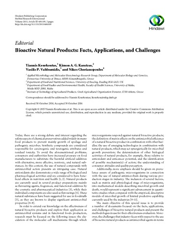 Kourkoutas, Y., Karatzas, K. A. G., Valdramidis, V. P. and Chorianopoulos, N. (2015) Bioactive natural products: facts, applications, and challenges. BioMed research international, 2015. 684109. ISSN 2314-6133 doi: 10.1155/2015/684109