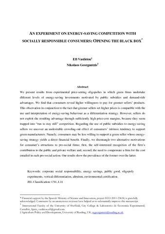 Georgantzis, N. and Vasileiou, E. (2015) An experiment on energy-saving competition with socially responsible consumers: opening the black box. Journal of Behavioral and Experimental Economics, 58. pp. 1-10. ISSN 2214-8043 doi: 10.1016/j.socec.2015.06.002
