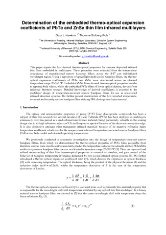 Hawkins, G. and Stolberg-Rohr, T. (2015) Determination of the embedded thermo-optical expansion coefficients of PbTe and ZnSe thin film infrared multilayers. Optics Express, 23 (12). pp. 16348-16355. ISSN 1094-4087 doi: 10.1364/OE.23.016348