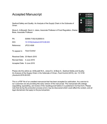 Al-Busaidi, M. A., Jukes, D. J. and Bose, S. (2016) Seafood safety and quality: an analysis of the supply chain in the Sultanate of Oman. Food Control, 59. pp. 651-662. ISSN 0956-7135 doi: 10.1016/j.foodcont.2015.06.023