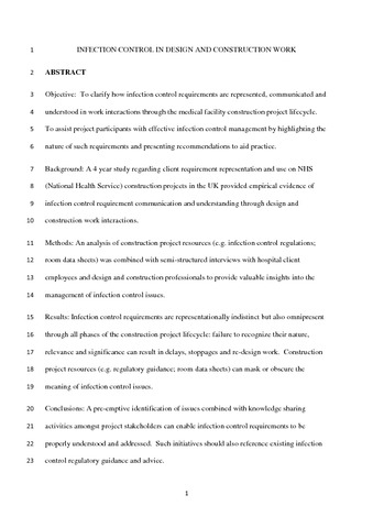 Collinge, W. H. (2015) Infection Control in design and construction work. Health Environment Research and Design Journal, 8 (3). pp. 68-79. ISSN 1937-5867 doi: 10.1177/1937586715577369